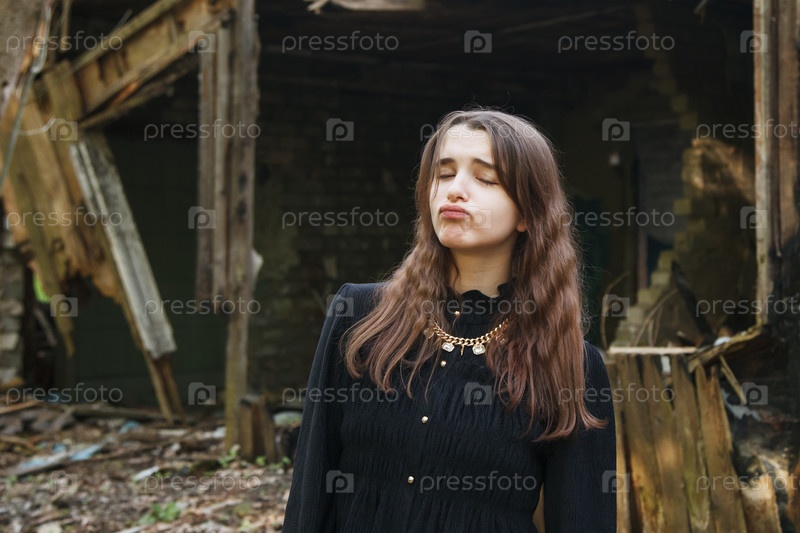 Молодая готическая девушка выходит из заброшенного дома в мрачный летний день