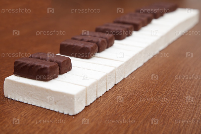 Клавиатура для фортепиано из шоколада и зефира на столе в ближайшем плане