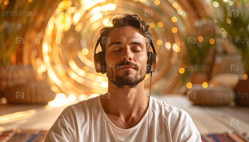 Мужчина наслаждается захватывающим музыкальным опытом с наушниками в среде, символизирующей расслабление, интроспекцию и цифровую гармонию