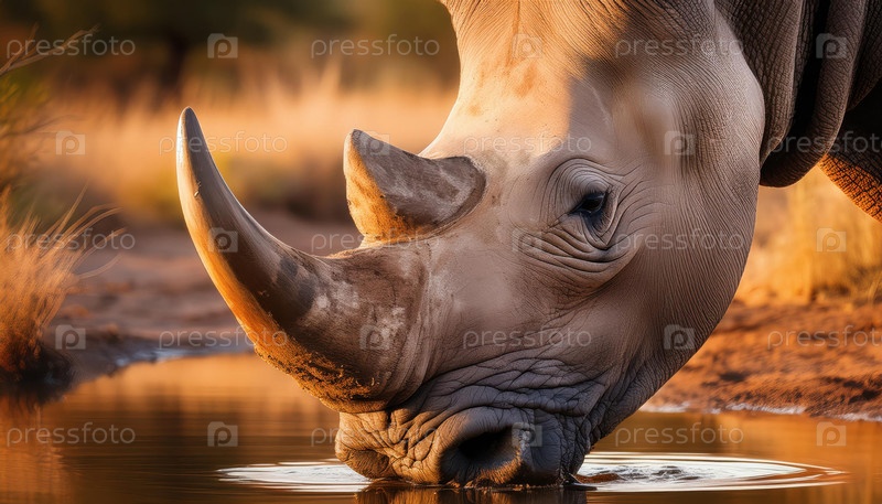 Близость носорога к питьевой воде из естественного пруда в золотом свете африканской саванны на закате