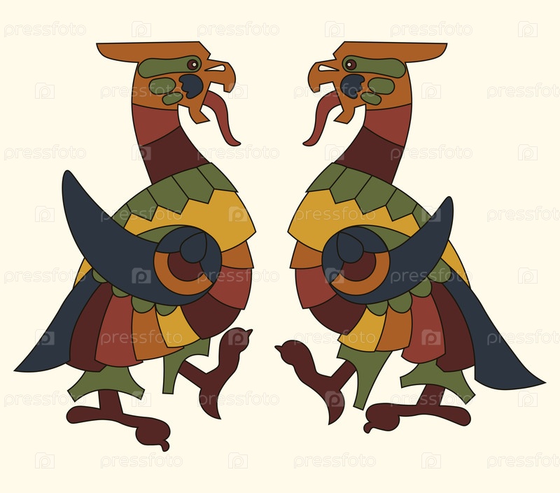 Векторная иллюстрация: сказочные птицы, изолированные на белом фоне в нео-русском стиле