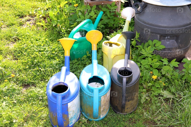 Вода в водоемах и бочках нагревается на траве под солнцем в саду