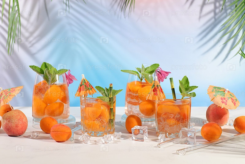 Холодный домашний лимонад, сок или коктейль с мятой, абрикосами, персиками и цитрусовыми фруктами, детоксикационная диета и концепция похудения, меню ресторана, выборочный подход