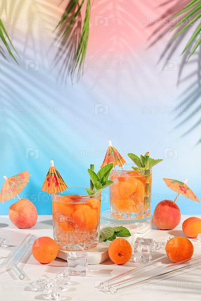 Современный натюрморт с мартини, алкогольным коктейлем, персиком, абрикосом и мятными ягодами на элегантном современном фоне, минималистическая концепция бара и праздника, кафе, рекламный баннер, селективная ориентация, пространство для текста