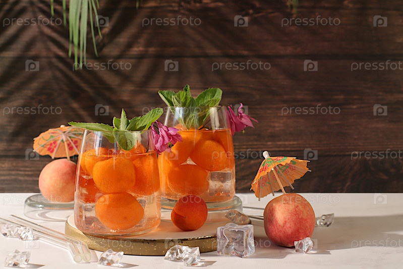 Чай с персиком или коктейль с мятой и абрикосами, освежающий рецепт летнего напитка.Два стакана персикового лимонада за деревенским столом, детоксикационная диета и концепция похудения, меню ресторана