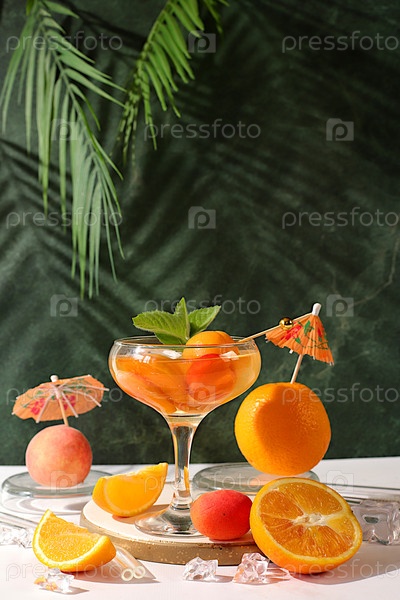 Современная жизнь с фруктами. алкогольный коктейль или пунш, ягодный персик, абрикос и мята на элегантном фоне, минималистическая концепция бара и праздника, кафе, рекламный баннер,