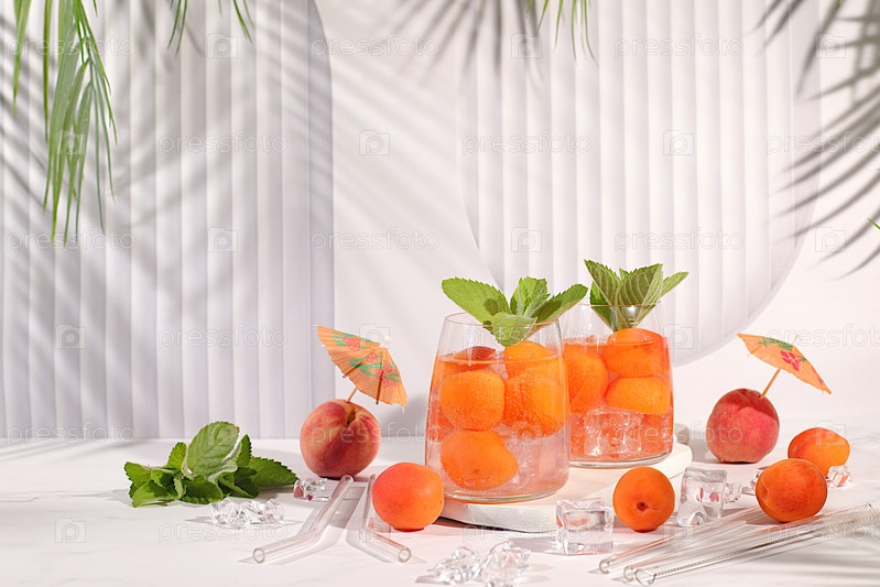 Холодный домашний лимонад, сок или коктейль с мятой, абрикосами, персиками и цитрусовыми фруктами, детоксикационная диета и концепция похудения, меню ресторана, выборочный подход