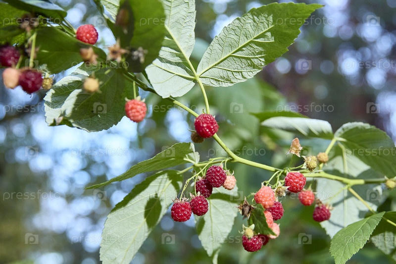 Зрелые красные малины, висящие на ветке