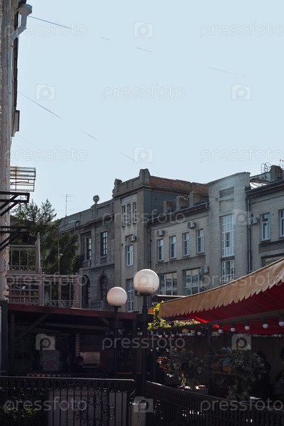 Ресторанная терраса со старым административным зданием