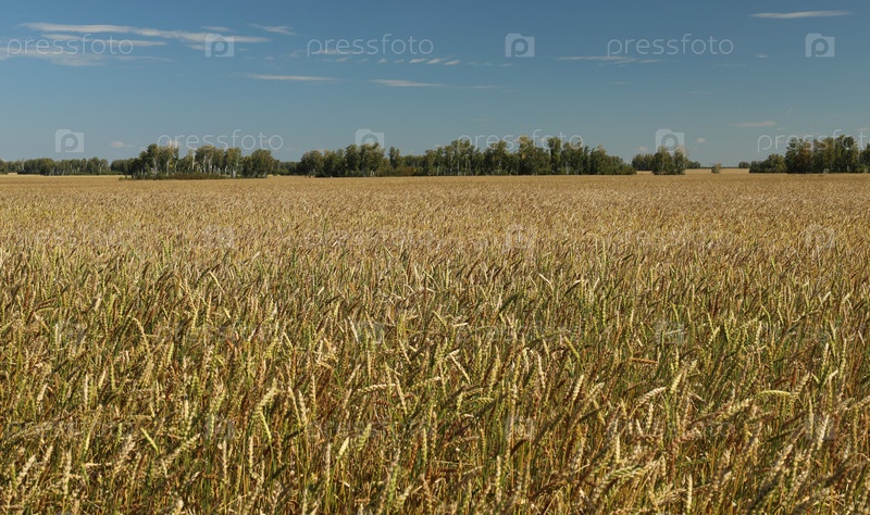 Пшеничное поле со спелыми и зелеными колосьями, зелёный лес на горизонте