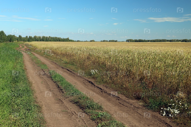 Сельская дорога вдоль поля спеющей пшеницы, небо и лес на горизонте