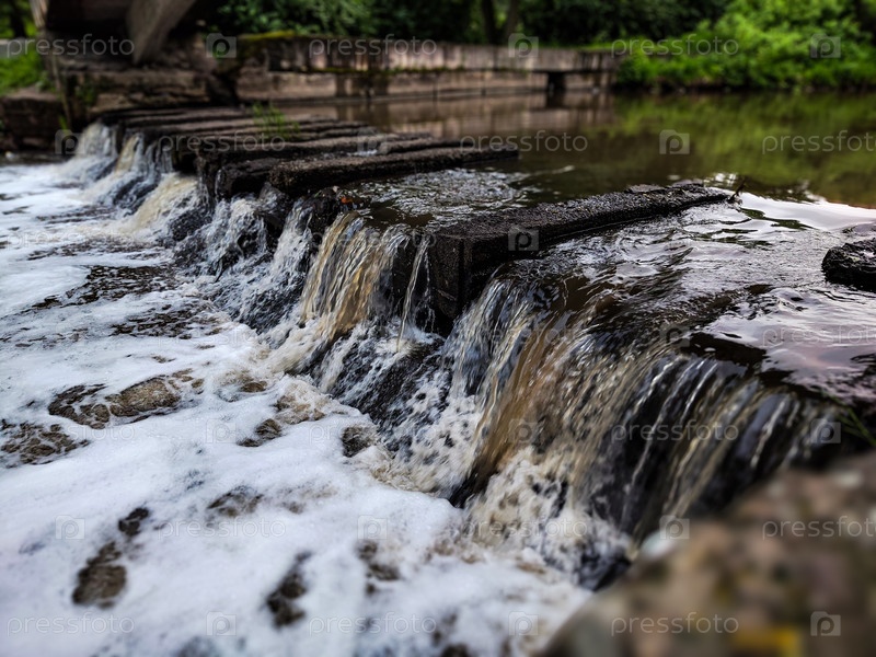 Небольшой городской водопад под пешеходным мостом