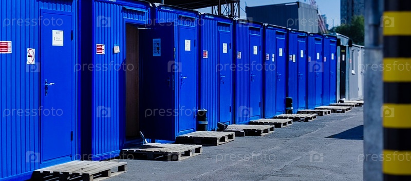 Ряд синих портативных кают на стройплощадке