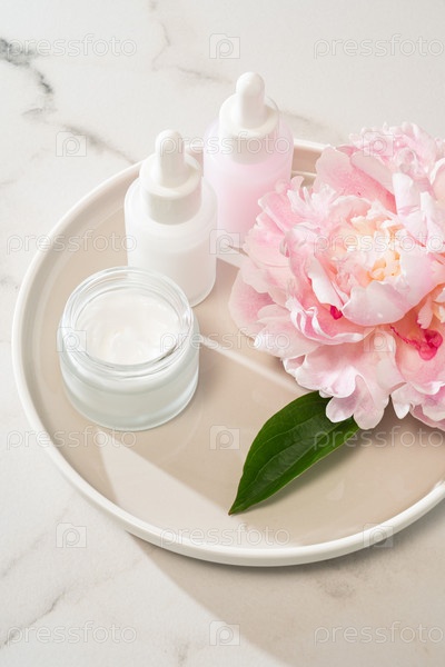Розовые пионы, стеклянный капельник для сыворотки молока и кружка с кремом расположены на бетонной подносе. шикарная натюрмортовая красота для минималистического брендинга
