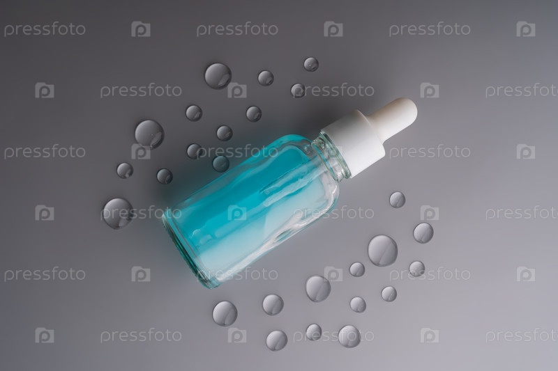 Синяя бутылка капельницы сыворотки на сером цвете с каплями воды