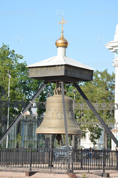 Бронзовый колокол возле входа в Смольный собор - православный храм в стиле барокко