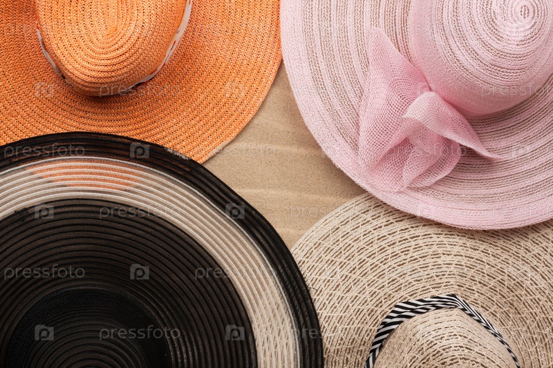 Четыре шляпы лежат на волнистом песке