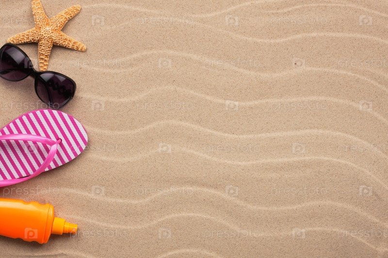 Аксессуары для пляжа, лежащие на песке с пространством для вашего текста