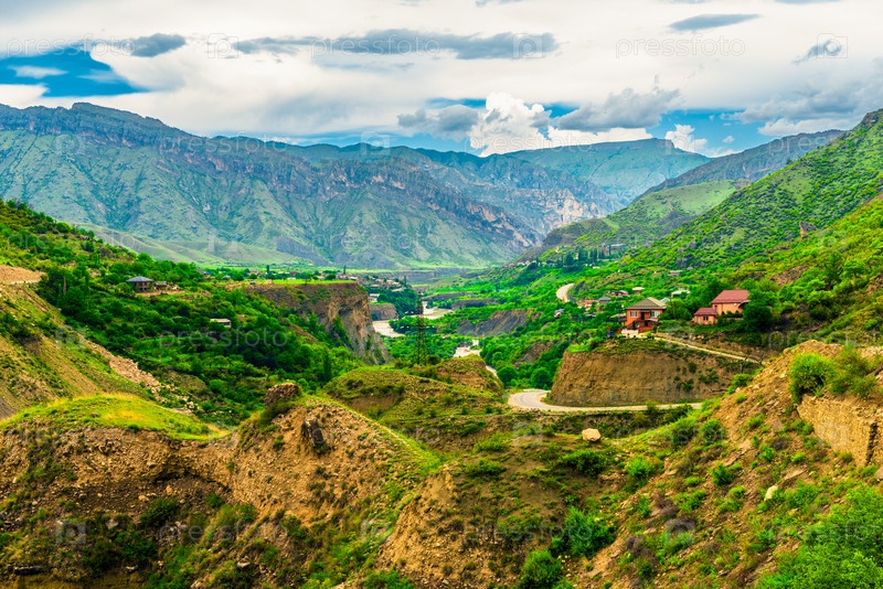 Драматический пейзаж живописной долины горной реки в пред штормовую погоду на Дагестанском высокогорье.Северный Кавказ.Россия