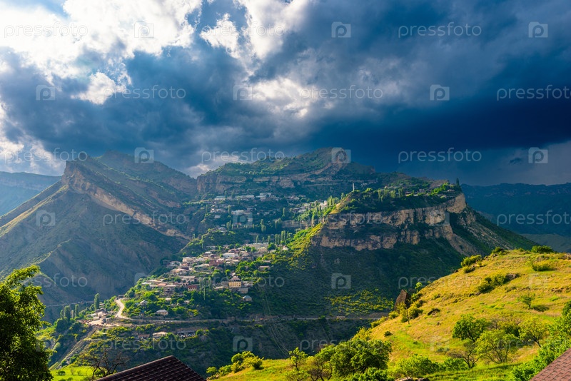 Драматический пейзаж живописного плато Гуниб в бурную погоду на Дагестанском высокогорье.Северный Кавказ.Россия