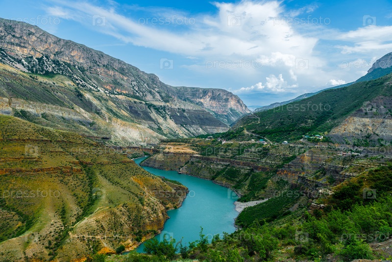 Живописный пейзаж на изгибе лазурной горной реки Сулак в красивом каньоне Кавказских гор Дагестана