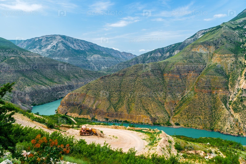 Живописный пейзаж Сулакского каньона в горах Северного Кавказа Дагестана с строительным оборудованием на грунтовой дороге