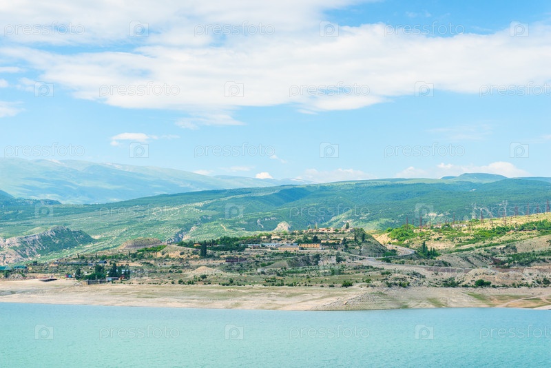 Красивый пейзаж горного водохранилища Чиркей с лазурьевой водой Северного Кавказа Дагестана.Россия
