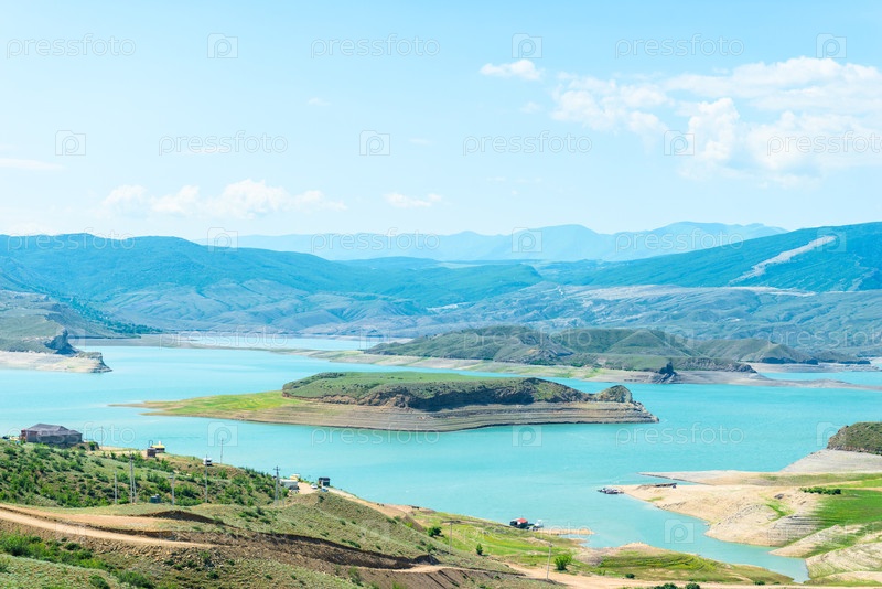 Красивый пейзаж горного водохранилища Чиркей с лазурьевой водой Северного Кавказа Дагестана.Россия