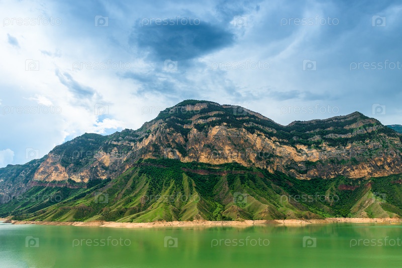 Живописный пейзаж с горным озером и слоистыми красивыми горами Северного Кавказа Дагестана Россия