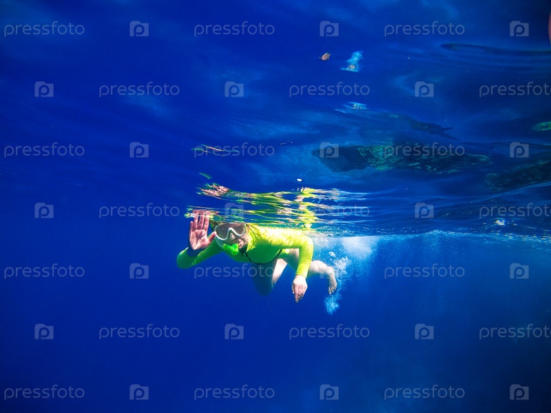 Женщина в зеленом купальном костюме и маске плавает под водой в голубом соляном море