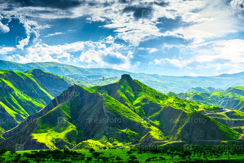 Живописный горный пейзаж с зелеными горами и драматическим небом.Дагестан, Кавказ