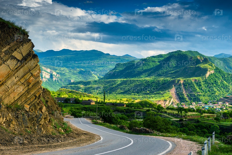 Живописный горный пейзаж с извилистой дорогой в горах Северного Кавказа