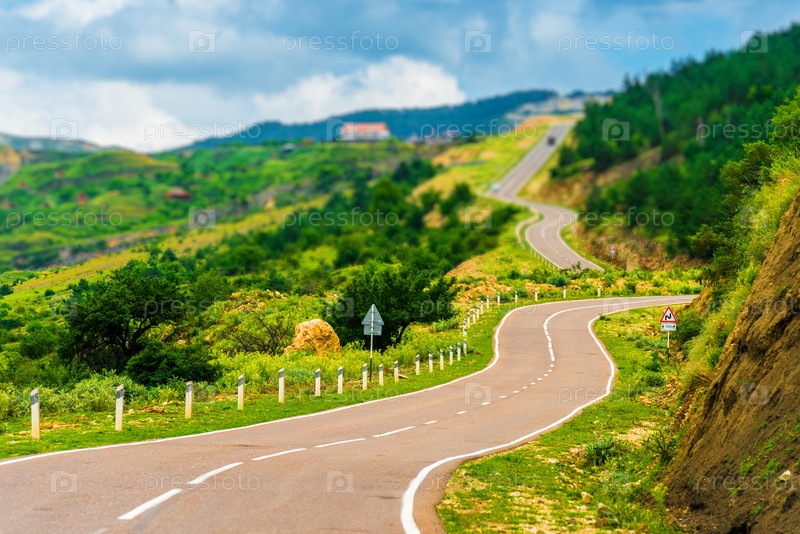 Живописный горный пейзаж с извилистой асфальтовой дорогой.Кавказ