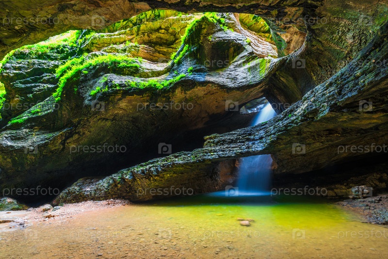Живописный подземный водопад Солтинский и озеро в Кавказских горах