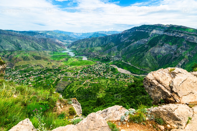Потрясающий горный пейзаж зеленой долины горной реки с скальными образованиями на переднем плане