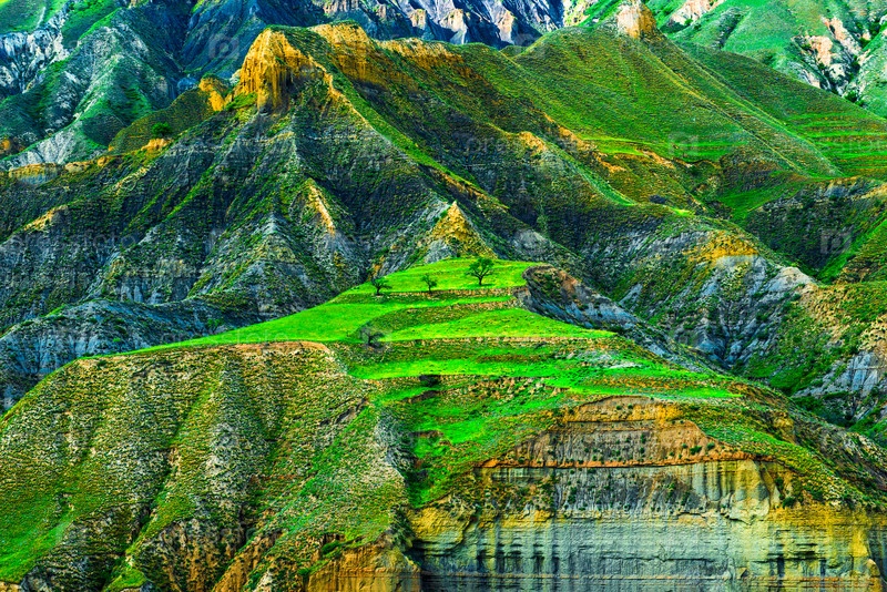 Живописный горный пейзаж зеленого склона с эрозией. Кавказ
