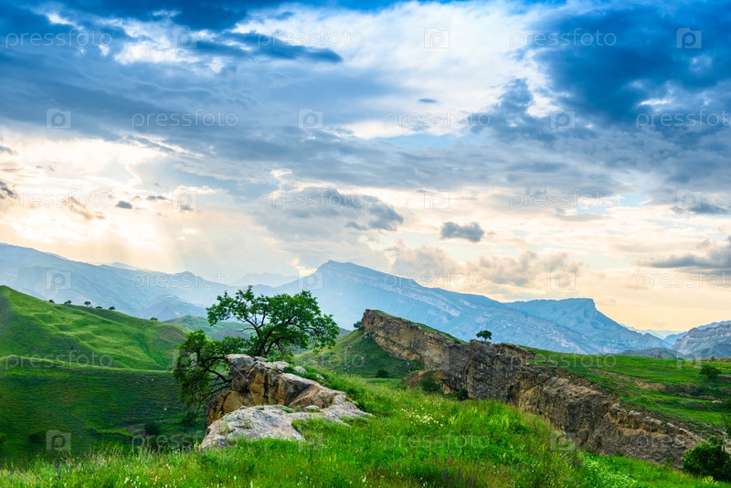 Живописный горный пейзаж с деревом на крутой скале и невероятно красивым небом