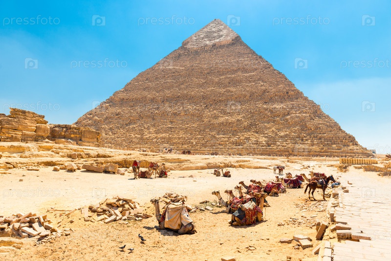 Верблюды отдыхают на фоне египетской пирамиды Хафры