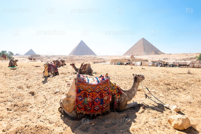 Нагруженные верблюды отдыхают на фоне величественных египетских пирамид под палящим солнцем пустыни Сахара