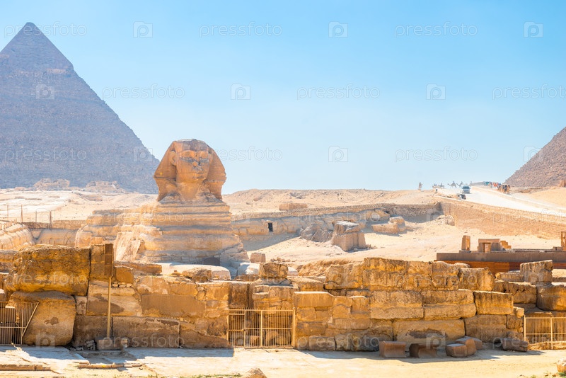 Величественный египетский сфинкс на фоне древних пирамид под палящим солнцем пустыни Сахара
