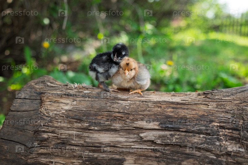Маленькие курицы сидят на бревне в деревне в солнечный летний день