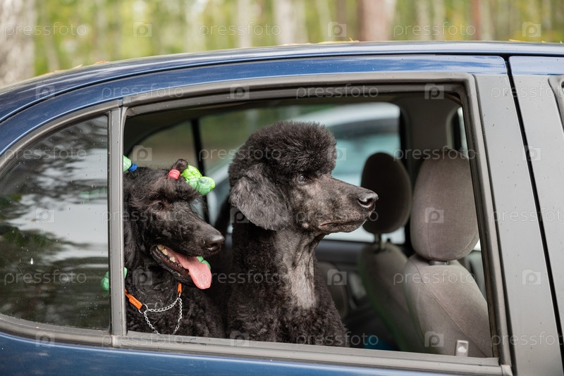 Два черных пуделя смотрят из окна машины с зеленой игрушкой в волосах