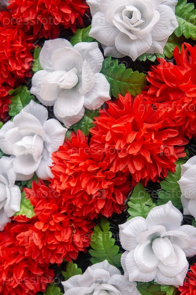 Фрагмент погребального венка, красно-белые искусственные цветы на фоне, закрыть фото