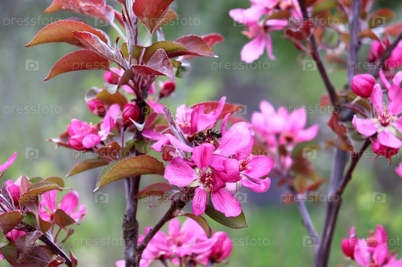 Пчела опыляет розовые цветы китайского яблоня в пасмурный весенний день