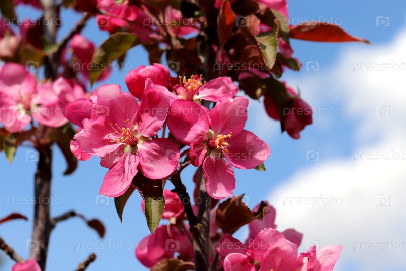 Розовые и коралловые цветы на цветении яблони китайского сорта Red Meat против голубого неба в солнечный весенний день