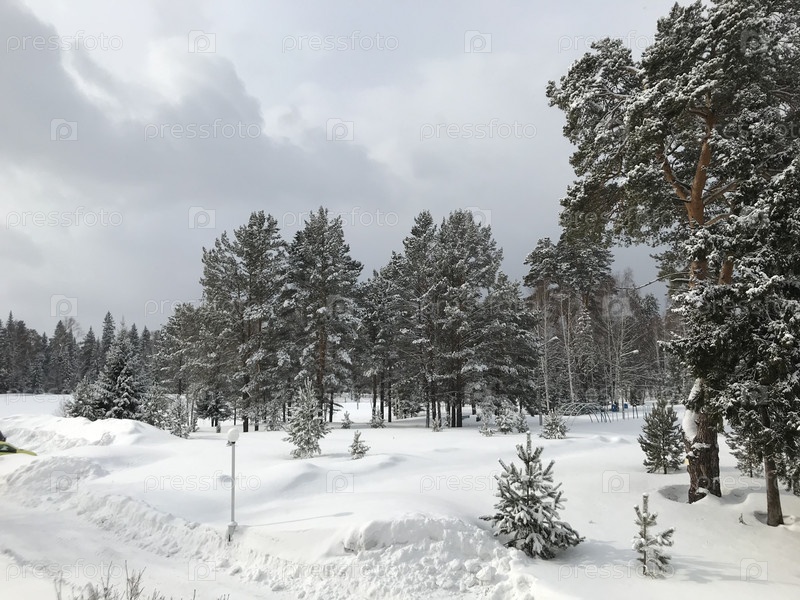 Снежный ландшафт с вечнозелеными деревьями под облачным небом зимой