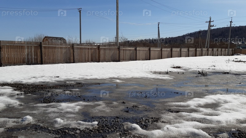 Зимний пейзаж с тающим снегом и лужайками под ясным голубым небом в сельской местности