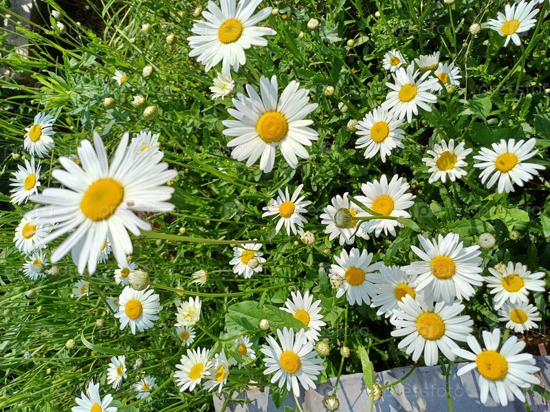 Ярко белые ромашки, цветущие в солнечном саду весной рядом с деревянным забором