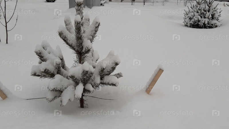 Заснеженные вечнозеленые деревья в спокойном зимнем ландшафте со свежим снегом, покрывающим землю