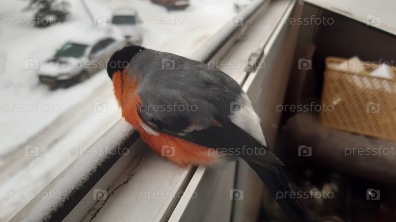 Птица сидела на подоконнике на снежном фоне зимой